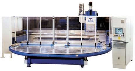 Die verfahrbare Maschinenbrücke garantiert größte Bearbeitungsfreiheit. Die ebene Oberfläche des Arbeitstisches aus Duraluminium ermöglicht, Werkstücke auf der Maschine äußerst bequem und sicher zu befestigen. Die optional 4. Achse erlaubt die Nutzung eines geraden oder konkaven Sägeblattes zum Schneiden von Geraden und Kurven.